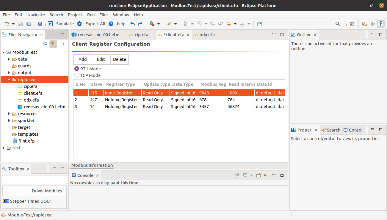 In addition to the core RAPIDSEA Modbus Protocol Stack, Embien also offers no-code development using Flint – a powerful, intuitive tool that empowers engineers to enable Modbus functionality without writing a single line of code. With Flint, the Modbus register addresses to be supported or accessed can be defined directly using the Flint Editor. Simply configure your setup, generate the code, and download it onto the target device – it will instantly start operating as a Modbus server or client, ready for seamless integration.