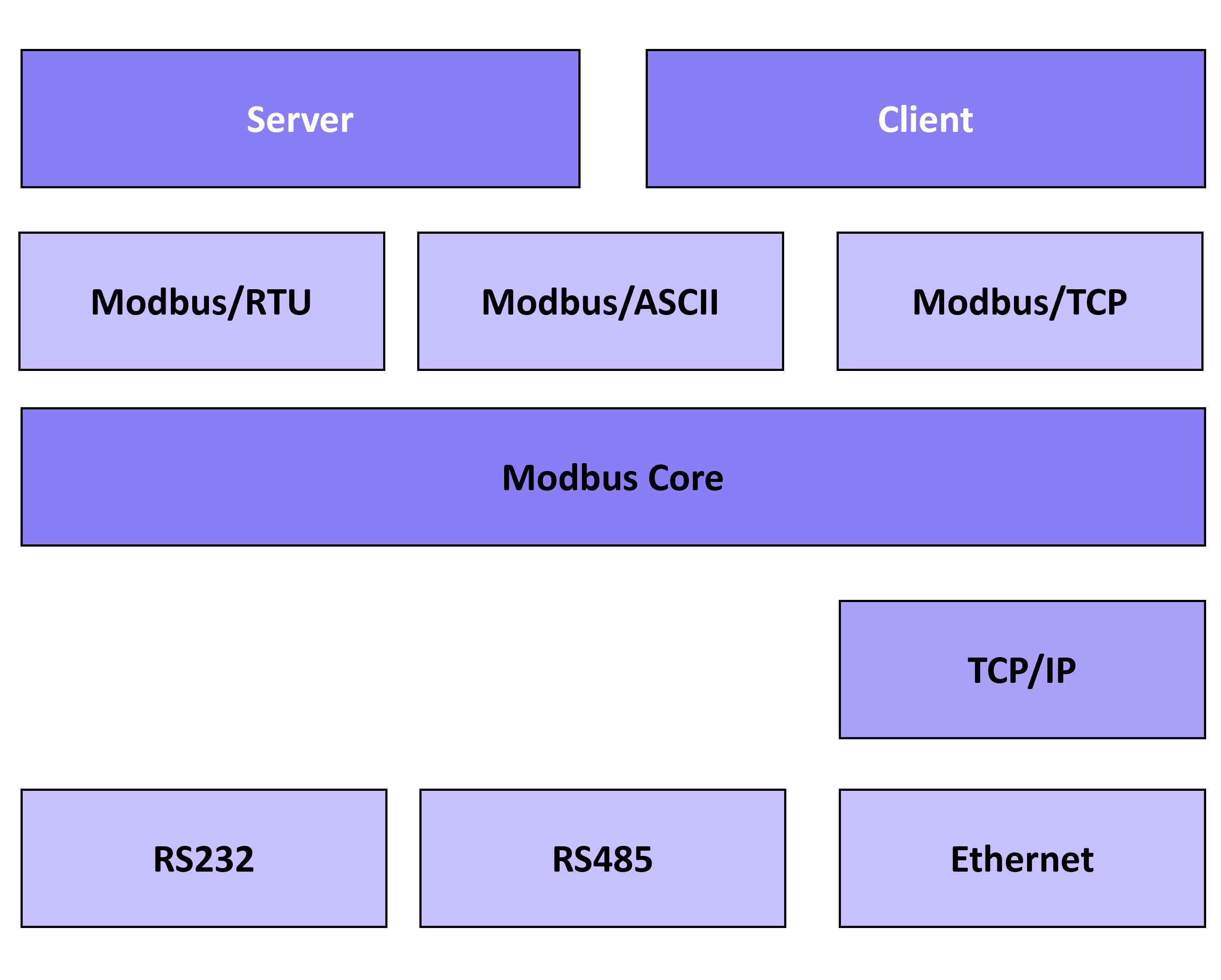 Supported physical layers are Modbus RTU. Modbus ASCII , and Modbus TCP/IP, and supported operating models are bare-metal, RTOS-based systems, and Linux / Windows.